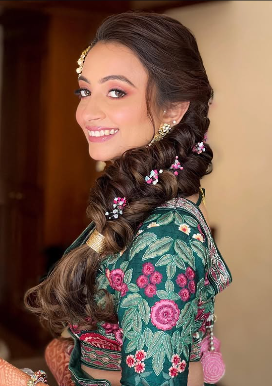 3. Romantic Side-Swept Braid with Soft Waves and Floral Details