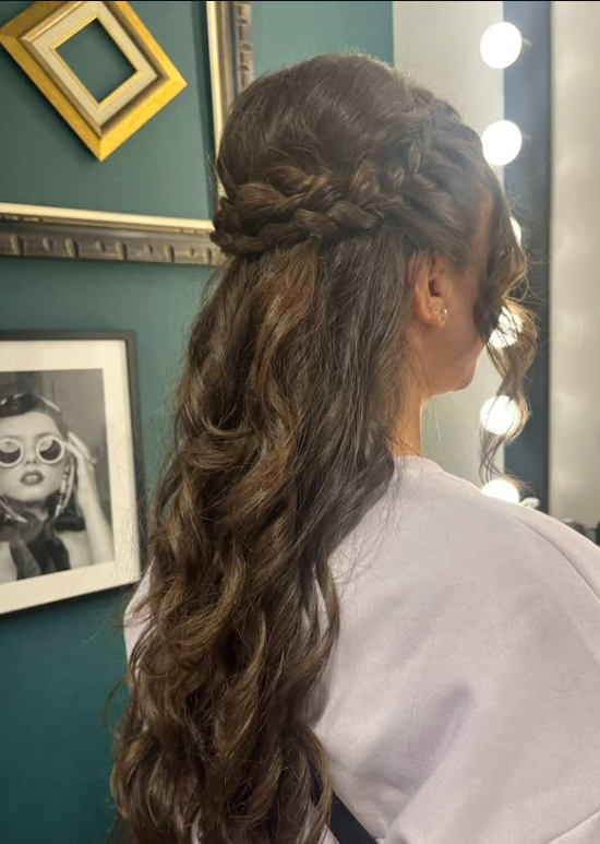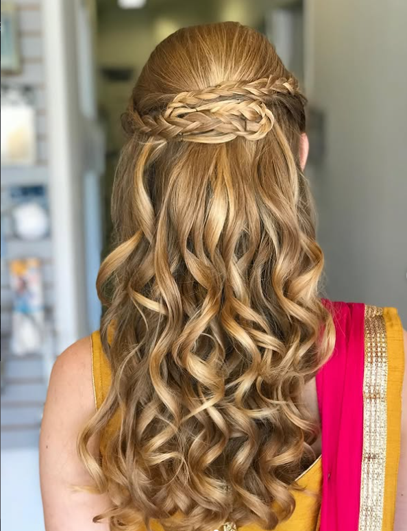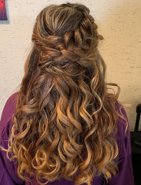 This braided bridesmaid hairstyle features a beautifully woven half-up design that blends twists and braids into soft, flowing curls.