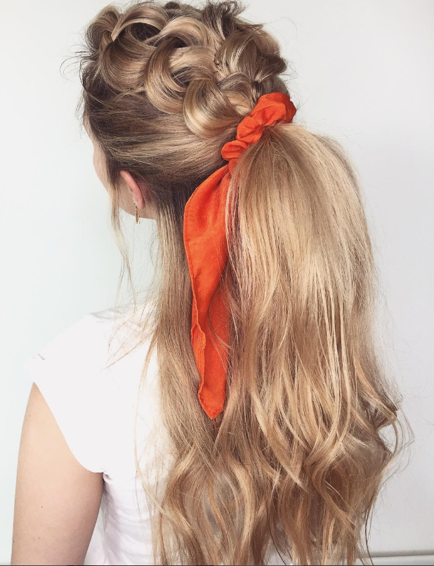 5. Textured Crown Braid with High Ponytail and Statement Ribbon