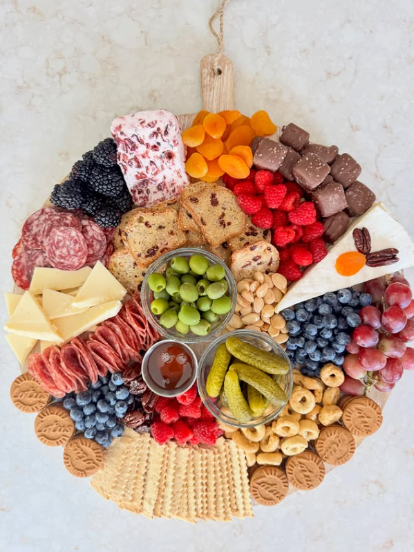 With juicy berries, dried apricots, chocolate bites, artisan cheeses, folded salami, olives, and crunchy crackers, it offers a little something for every guest.