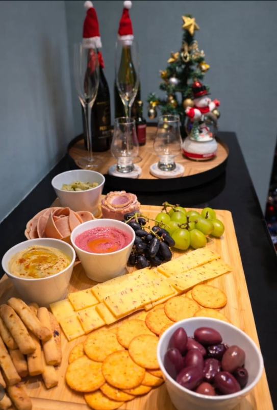 The warm wood board and festive backdrop create a relaxed, welcoming vibe that feels personal and thoughtfully curated.