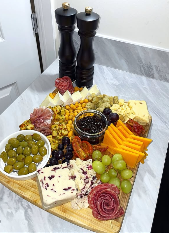 With sharp cheddar slices, creamy specialty cheeses, briny olives, juicy grapes, savory meats, and a rich jam centerpiece, it delivers bold flavor without feeling overcrowded.