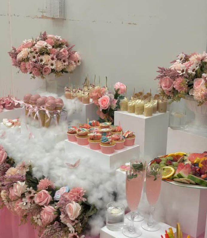 From the pastel cupcakes and mousse cups to the beautifully styled cake pops and fruit display, every detail is thoughtfully curated to feel cohesive and luxurious.
