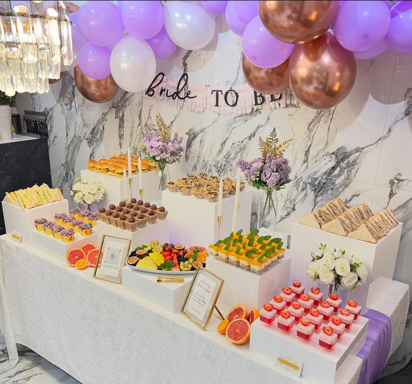 If you’re planning a bridal shower that feels chic, full, and photo-ready, combining a dessert table with a light grazing spread like this creates a luxurious experience guests will remember — and definitely post about.