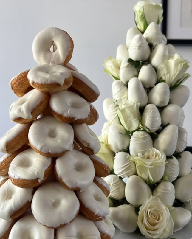 One tower features stacked glazed donuts arranged in a dramatic cone display, while the other showcases chocolate-dipped strawberries nestled between fresh white roses.