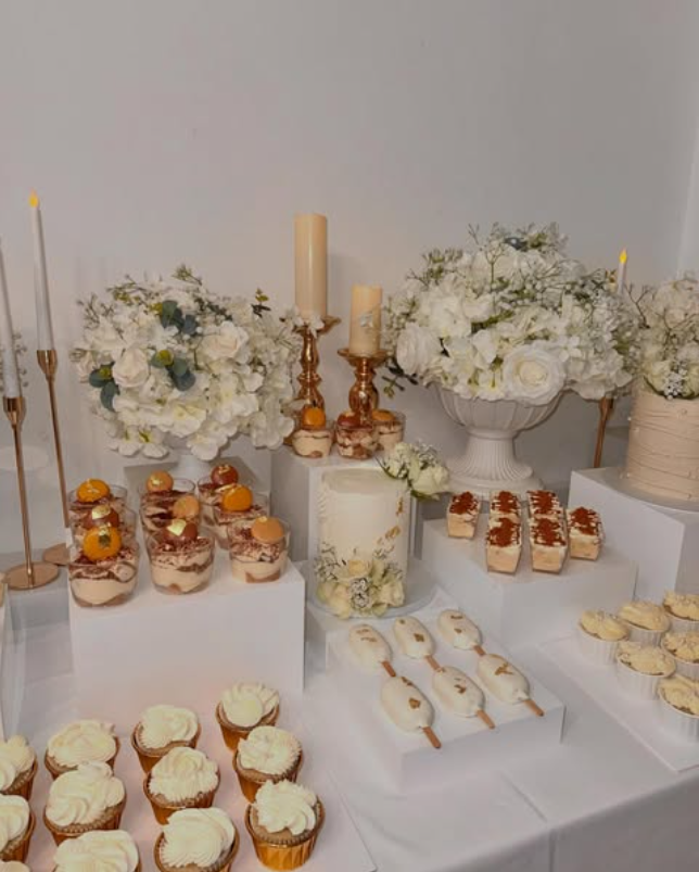 From the intricately piped buttercream cakes to the neatly arranged cupcakes and mini layered desserts, every element feels thoughtfully styled.