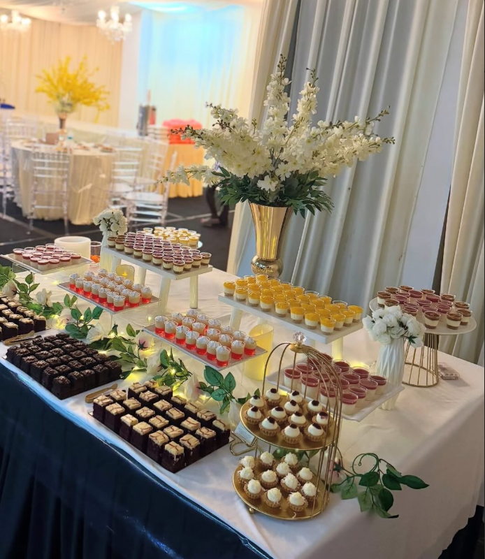 From colorful layered mousse cups to rich chocolate squares and delicate bite-sized cheesecakes, the spread feels abundant yet perfectly organized.