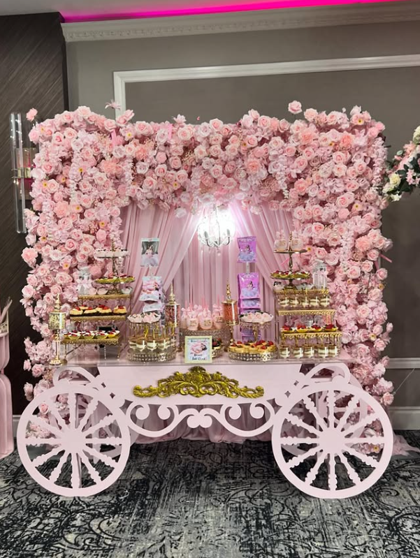 Framed by an overflowing wall of soft pink roses and sheer blush draping, the entire setup creates a dreamy, romantic backdrop that instantly steals the spotlight.