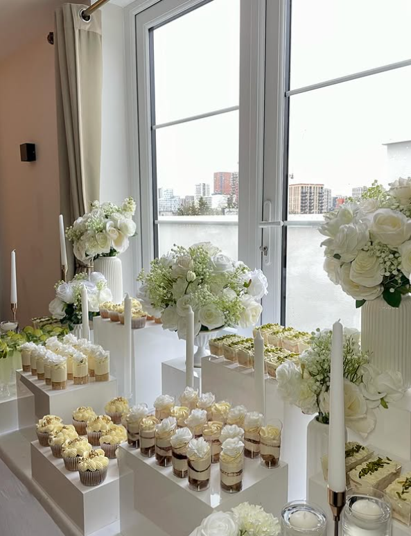 The desserts are styled beautifully on mirrored and tiered stands, adding height and dimension while keeping the look polished.