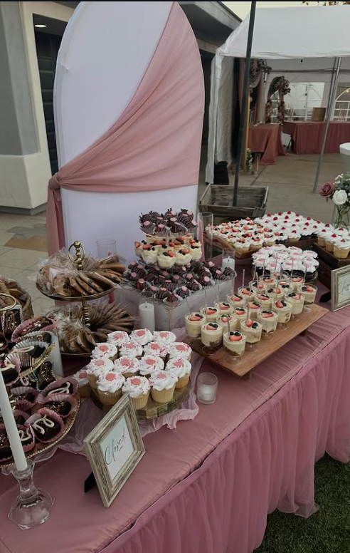 From frosted cupcakes topped with strawberries to colorful bite-sized desserts and fresh fruit trays, the spread feels generous yet thoughtfully styled.