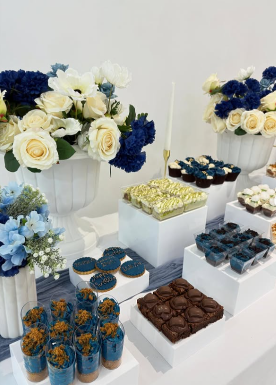 From deep blue dessert cups and chocolate brownies to delicate cake squares and frosted cupcakes, every treat complements the navy-and-cream palette beautifully.