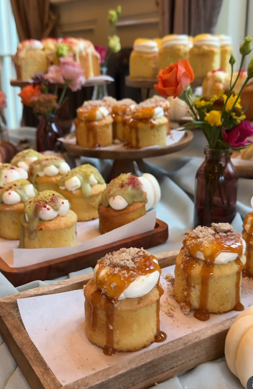 The mini sponge cakes topped with silky frosting and glossy caramel drizzle instantly steal the spotlight, giving the entire setup a bakery-fresh, made-with-love charm.