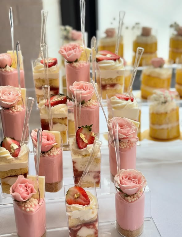 Each dessert is individually styled with delicate piped roses, pearl sprinkles, and tiny gold accents, making every cup feel like its own little masterpiece.