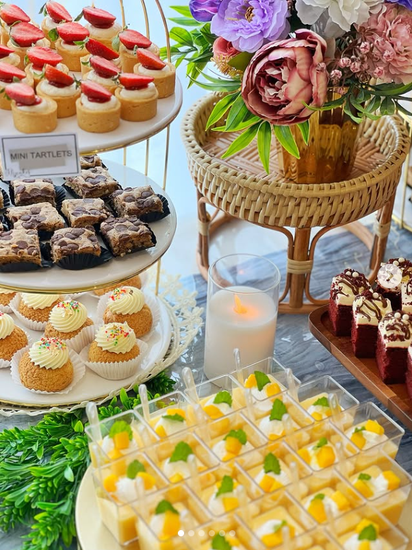 The variety of bite-sized treats — from strawberry-topped mini tartlets and chocolate chip bars to red velvet cake squares and citrus mousse cups — keeps the table visually interesting and guest-friendly.