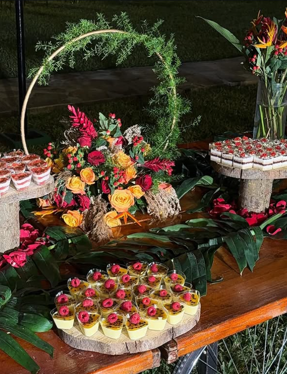 If you’re planning a bridal shower with a tropical, garden, or boho-luxe theme, combining bold florals with organic textures and elegant mini desserts creates a stunning, high-impact display that guests won’t stop admiring.