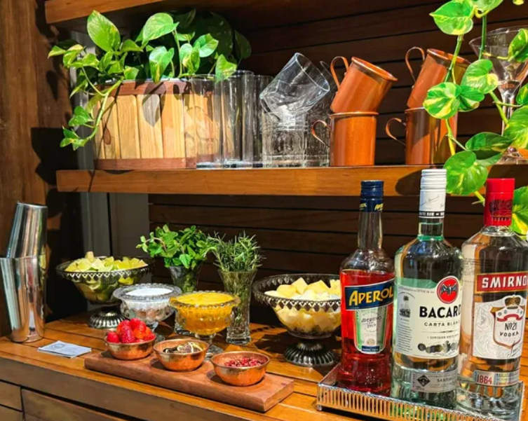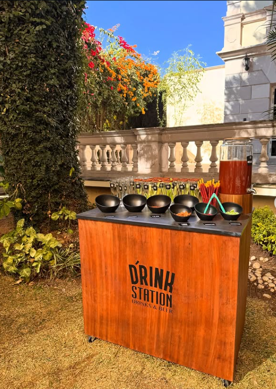 The clean wooden bar, bold “Drink Station” signage, and neatly arranged garnishes create a modern, organised setup that’s both stylish and functional.