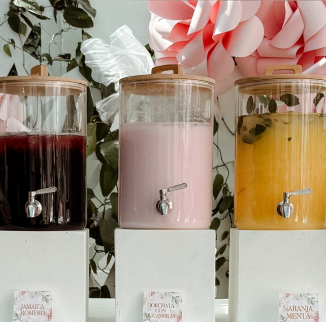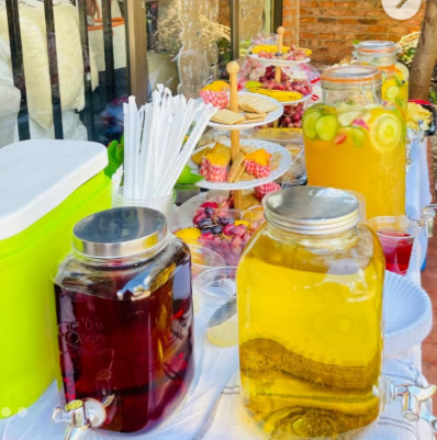 With coordinated beverage dispensers in blush, berry, and citrus tones, the setup feels thoughtfully styled and perfectly on theme.