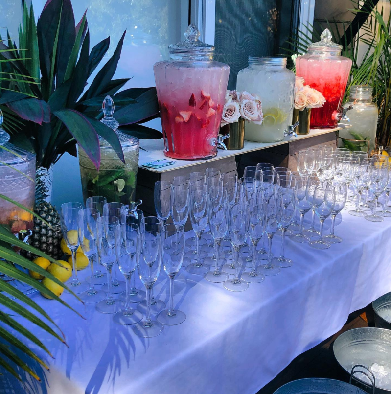 With vibrant fruit-infused punches displayed in elegant glass dispensers, rows of sparkling flutes ready for toasts, and lush tropical greenery framing the table, the entire setup feels elevated and unforgettable.