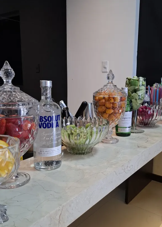 With crystal jars filled with fresh fruit, elegant glass bowls of garnishes, and premium spirits displayed on a sleek marble counter, the setup strikes the perfect balance between sophistication and celebration.