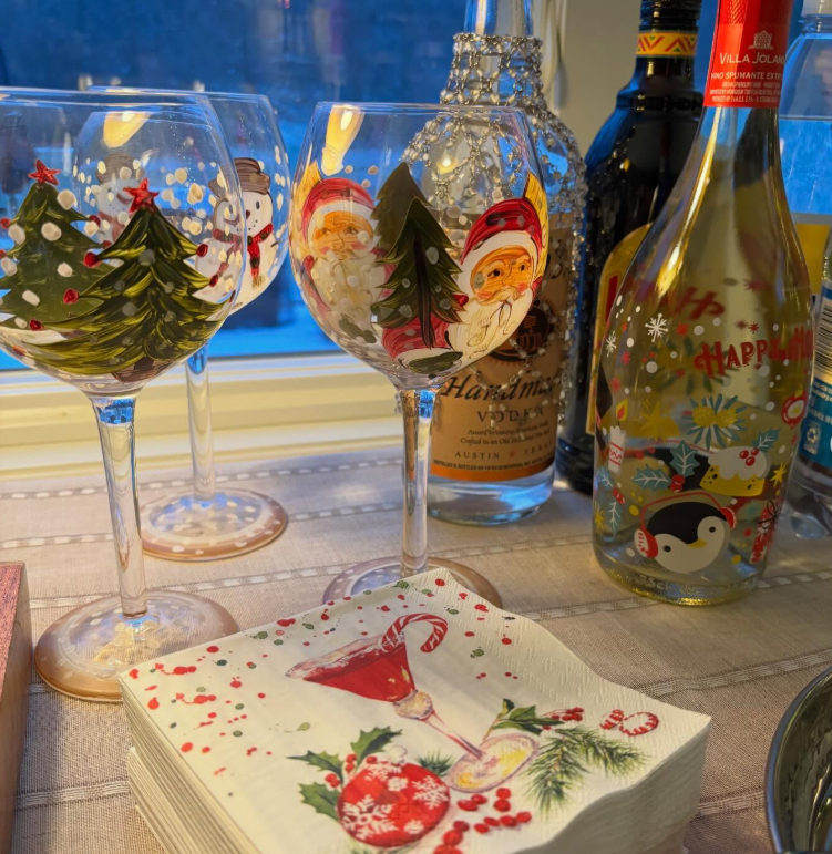 From hand-painted holiday wine glasses to sparkling bottles and playful cocktail napkins, every detail adds charm without overwhelming the setup.