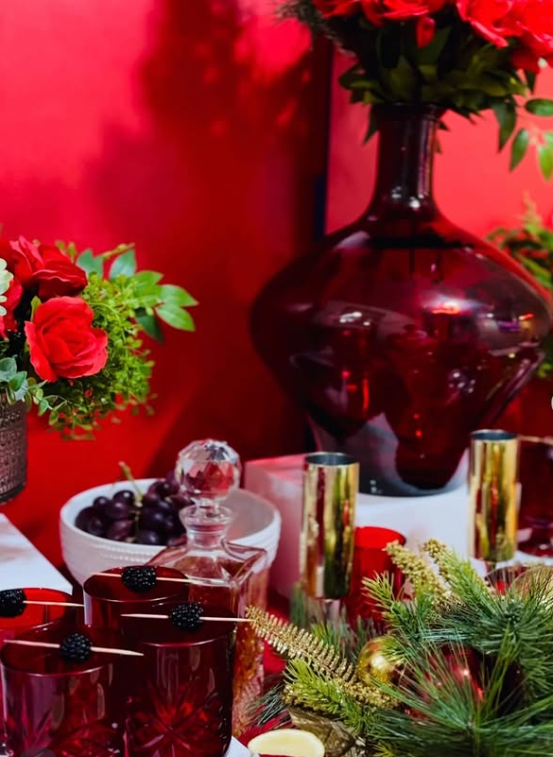 The rich red backdrop, deep-toned glassware, fresh florals, and gold accents create a luxe atmosphere that instantly elevates the celebration.