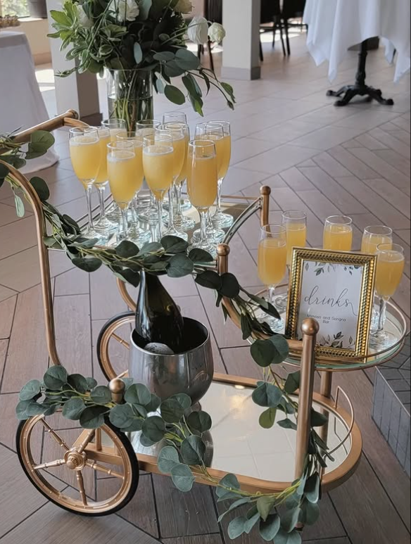 A chic gold bar cart styled with fresh greenery, chilled bubbly, and perfectly poured mimosas creates a refined yet inviting focal point.
