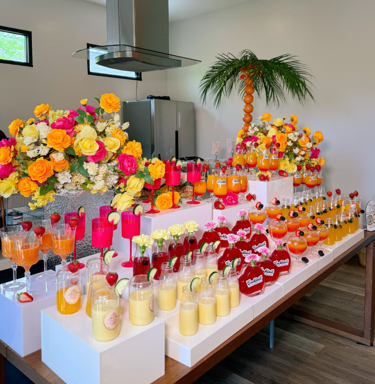 With beautifully garnished signature cocktails, fresh citrus accents, and bold florals, the setup instantly creates a lively, welcoming focal point.