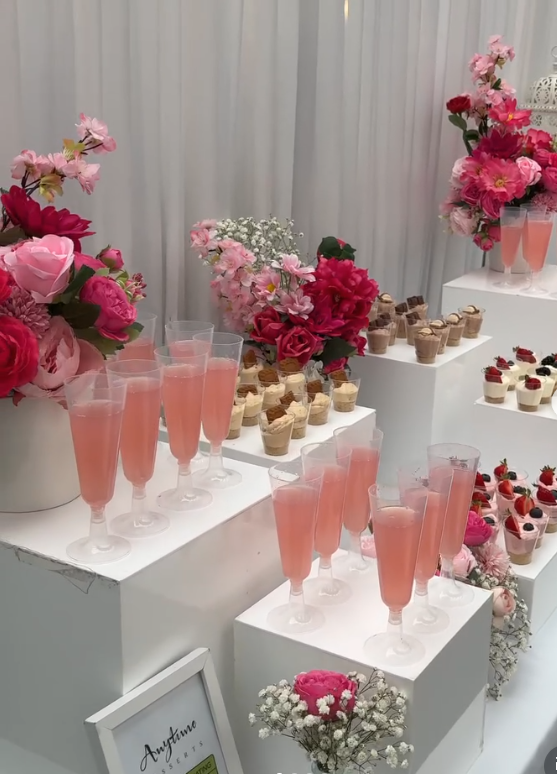 Soft blush cocktails served in delicate flutes, layered with fresh florals and beautifully displayed mini desserts, create a setup that feels dreamy and thoughtfully styled.