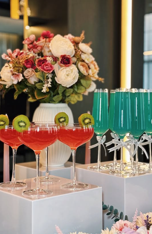 It’s the perfect inspiration for a bride who loves bold details and eye-catching presentation — a cocktail station that instantly energises the party and turns every drink into a statement piece.