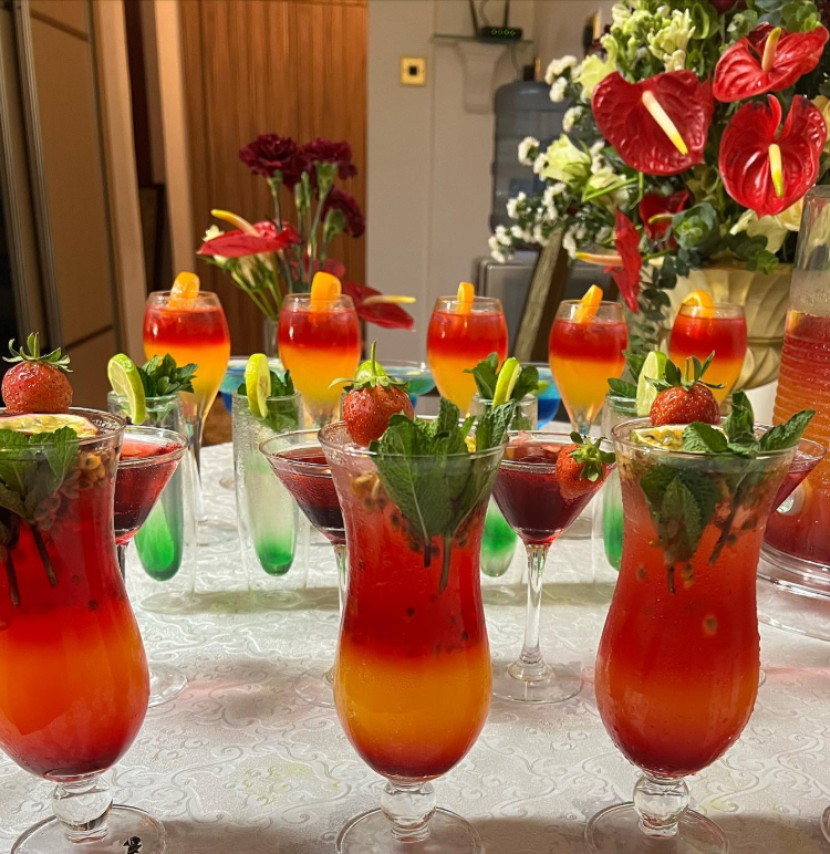 From the layered sunset-hued cocktails to the fresh mint, strawberries, and citrus garnishes, every glass feels vibrant and celebration-ready.