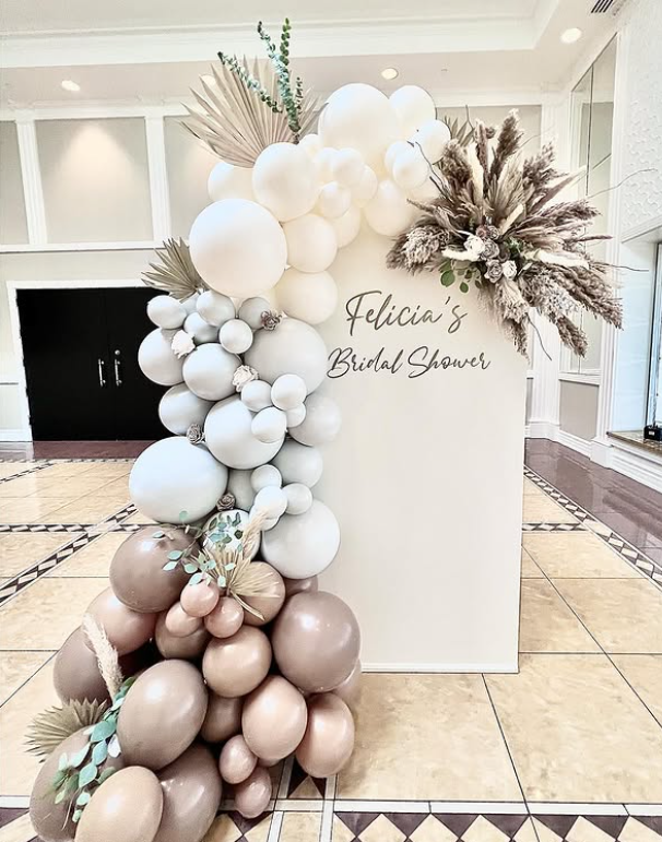 The soft ivory backdrop paired with cascading balloons in white, taupe, and champagne creates such a refined, high-end look.