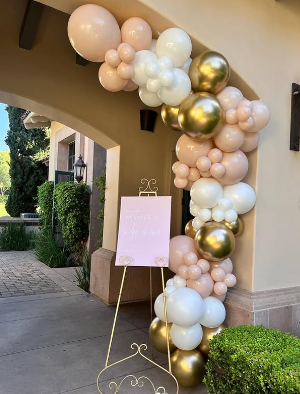 The cascading balloon arch in blush, ivory, and metallic gold instantly frames the doorway, creating such a grand and inviting first impression.