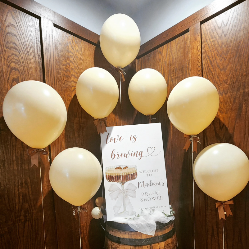 The soft gold balloons tied with delicate brown bows add just the right touch of elegance while keeping the theme cohesive and playful.