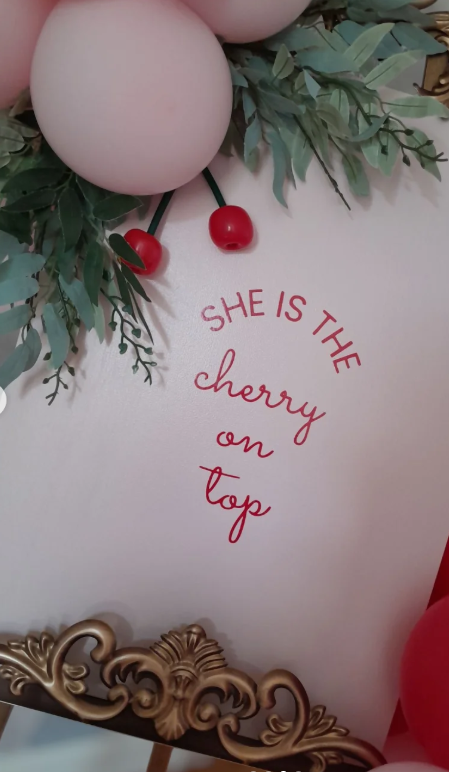 The “She Is the Cherry on Top” phrase instantly sets a fun and celebratory tone, while the bold red script adds a pop of color that feels fresh and flirty.