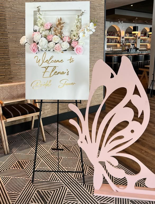 The oversized butterfly detail beside the sign brings in a whimsical element that makes the whole display feel unique and memorable.