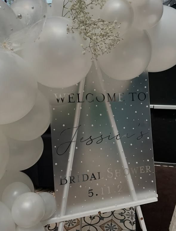 20. Modern Frosted Acrylic Bridal Shower Entrance Sign with Pearl Details