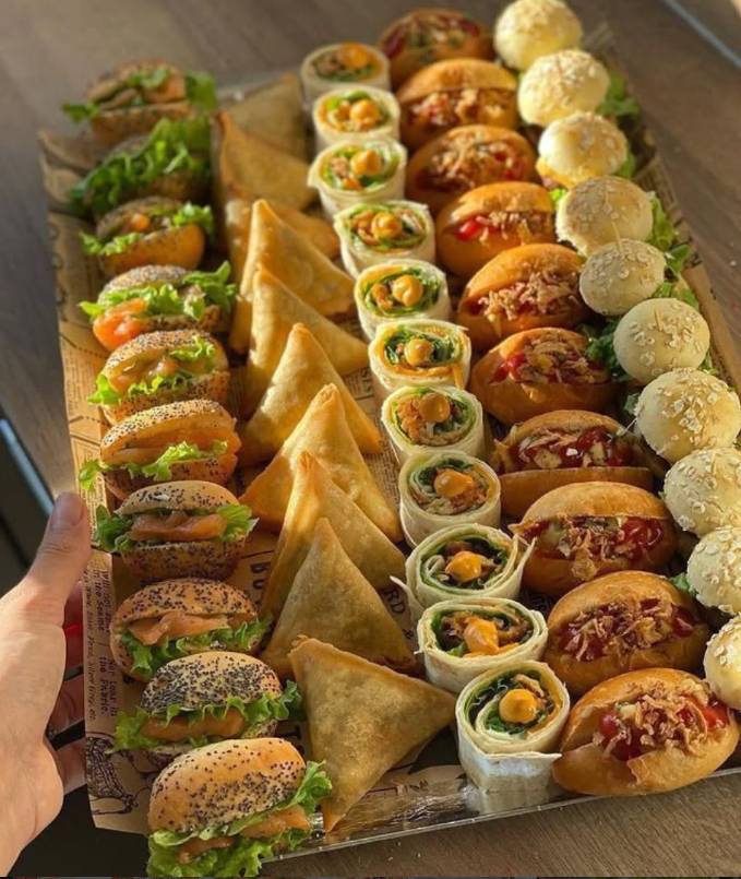 From mini sliders and delicate wraps to crispy samosas and soft bite-sized buns, this mix of savory appetizers keeps guests mingling while enjoying perfectly portioned bites.