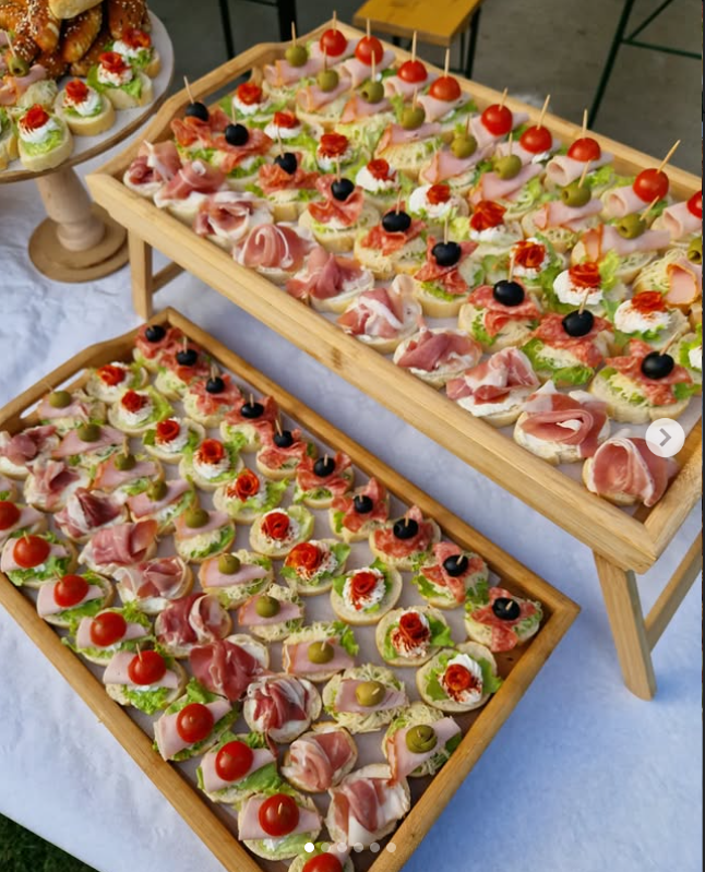 These delicate, open-faced bites topped with prosciutto, olives, cherry tomatoes, fresh greens, and creamy spreads create a display that looks as stunning as it tastes.
