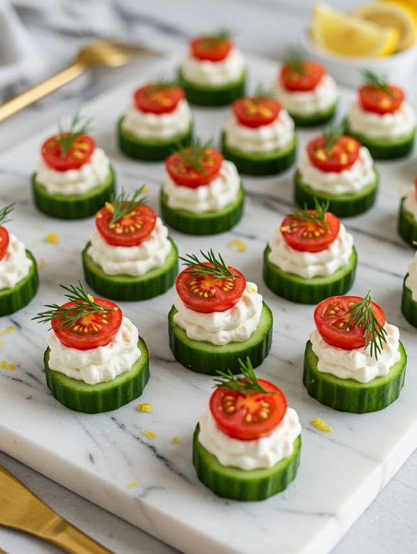 Thick cucumber rounds are topped with a swirl of herbed cream cheese and finished with juicy cherry tomatoes and a touch of fresh dill for an elegant finish.