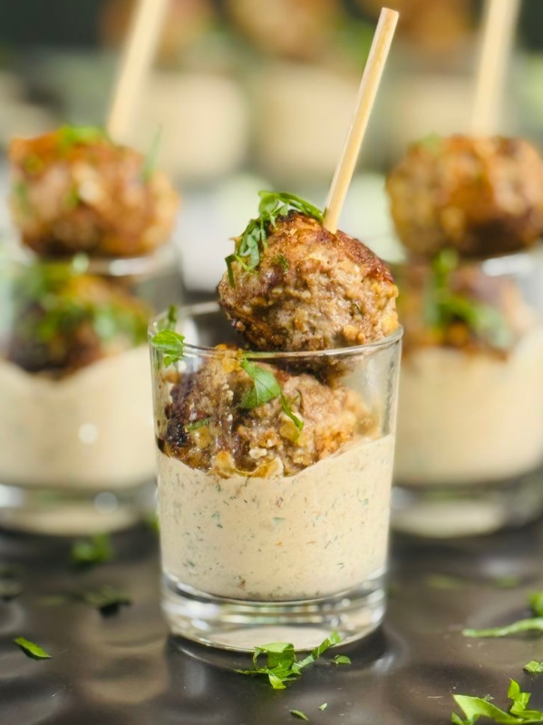 Juicy, flavorful meatballs are placed in small glasses filled with a creamy herb sauce, creating a beautifully layered and mess-free presentation.