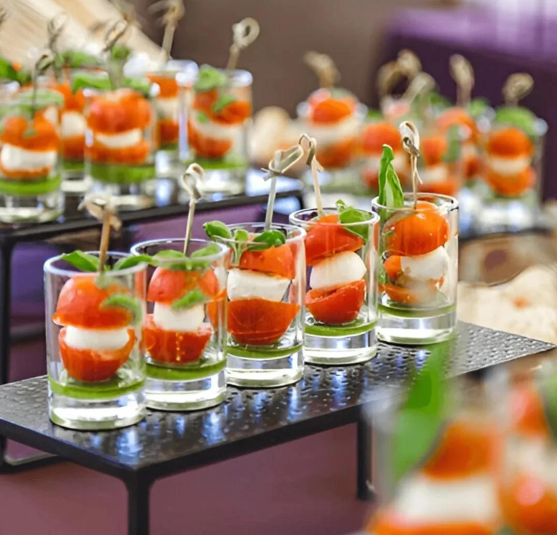 Layers of juicy tomatoes, creamy mozzarella, and fresh basil are beautifully stacked inside clear mini glasses, creating a polished, restaurant-style presentation that feels perfect for a bridal shower.