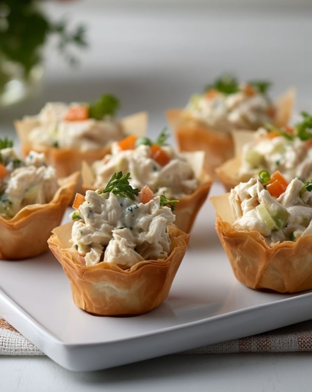 Crisp, golden phyllo shells are filled with creamy chicken salad mixed with fresh herbs and finely chopped vegetables, creating a light yet flavorful bite.
