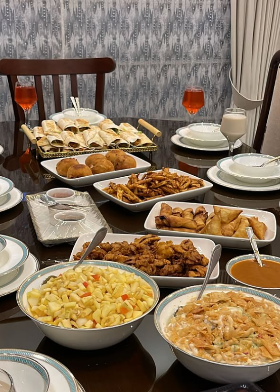 Set around a dining table, the mix of warm appetizers, fresh salads, crispy bites, and neatly plated dishes feels welcoming and intimate.