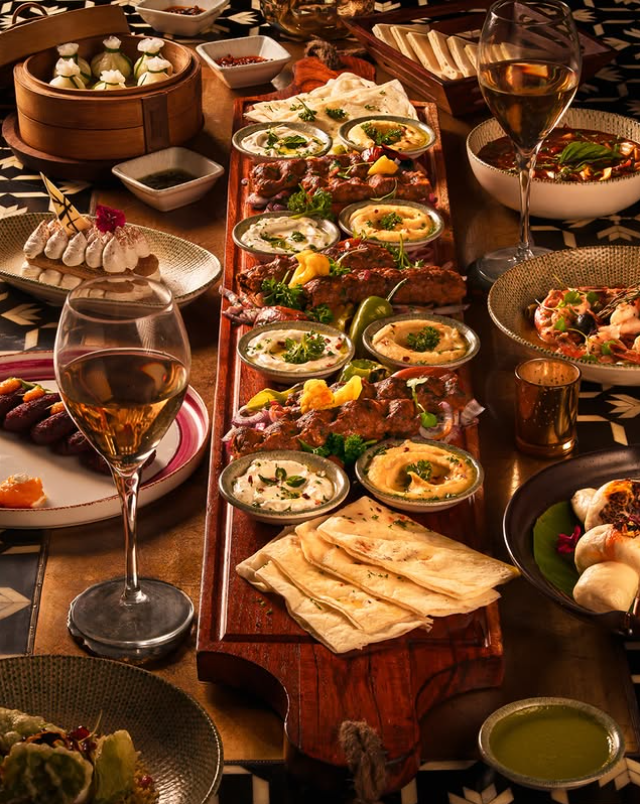 Served on a long wooden board, the mix of grilled meats, creamy dips, flatbreads, and vibrant garnishes creates a stunning centerpiece that feels both abundant and refined.