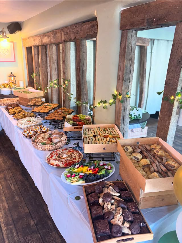 With wooden beams, soft string lights, and a long buffet lined with pastries, sandwiches, pizza, desserts, and fresh veggies, the setup feels relaxed yet beautifully styled.