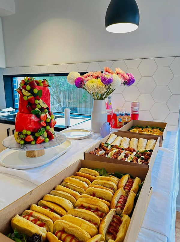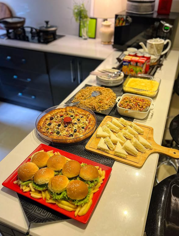 With sliders, fries, pizza, pasta, and bite-sized sandwiches neatly arranged along the counter, the setup feels modern and effortless while still looking polished.