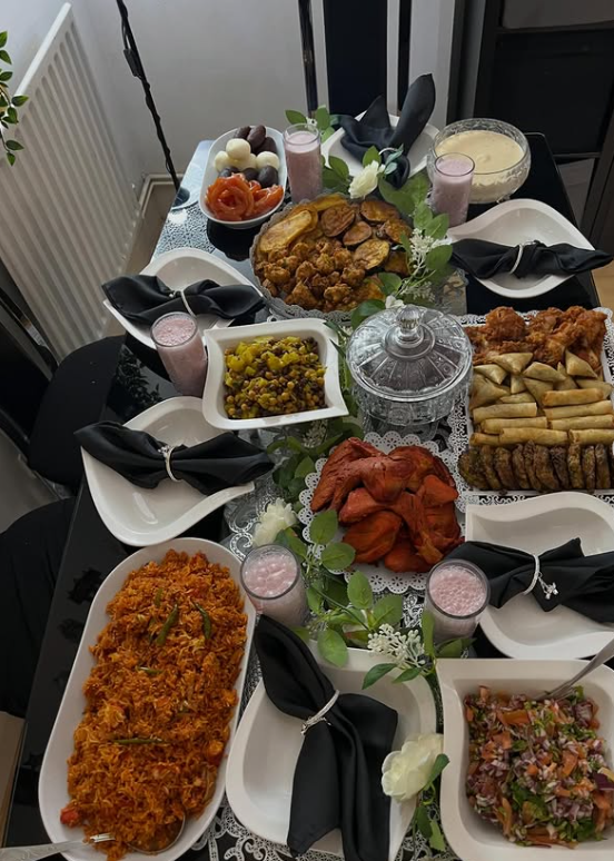 With neatly plated dishes, warm appetizers, vibrant sides, and coordinated black napkins, the setup feels balanced and polished without being overdone.