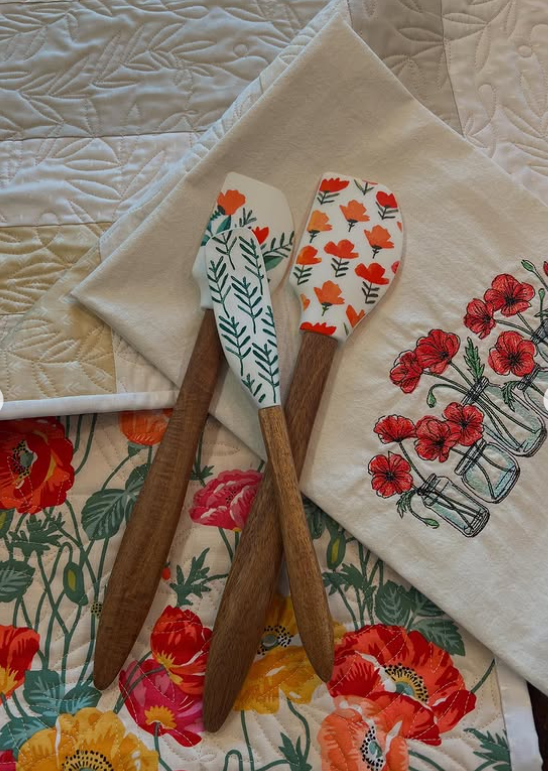 Floral silicone spatulas paired with a coordinating tea towel feel thoughtful, practical, and totally on theme for a bridal shower celebrating a new chapter.