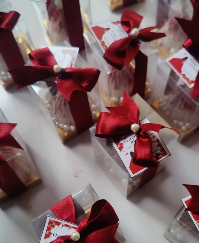 Clear favor boxes filled with sweets and topped with a rich satin bow instantly make your prize table look styled and intentional. That deep red ribbon? It adds such a beautiful, luxe touch.