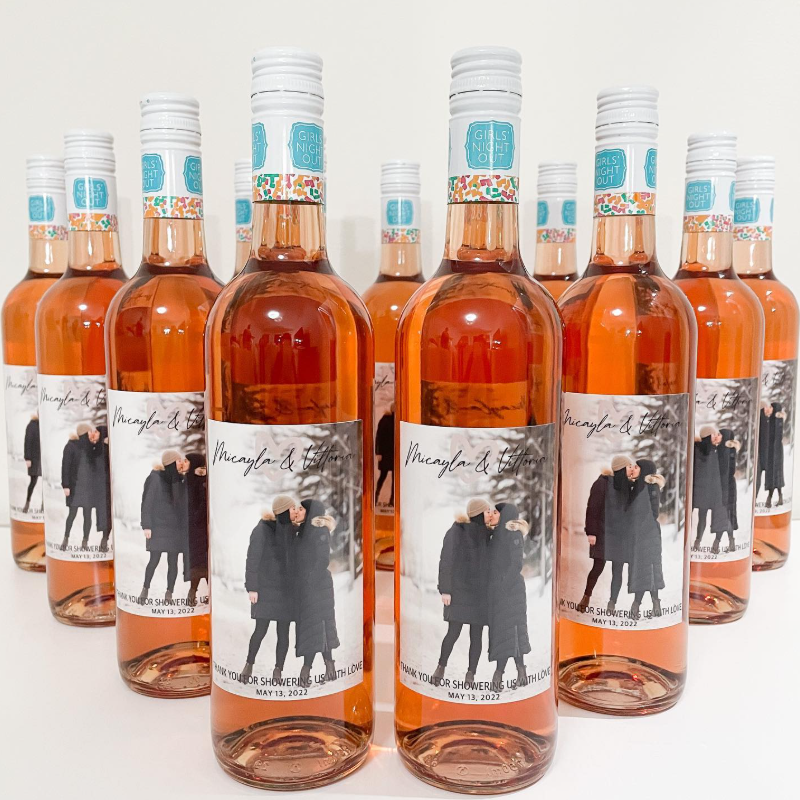 Adding a custom label with the couple’s photo, names, and shower date turns a simple bottle into a meaningful keepsake.